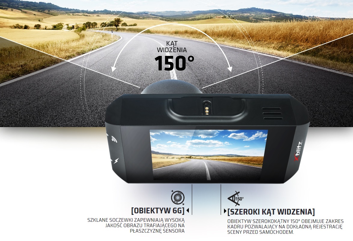 Obiektyw Xblitz V2 posiada szeroki kąt 150°. Takie paremetry sprawiają, że kamera samochodowa Xblitz V2 sprawdzi się idealnie zarówno na drogach podmiejskich jak i obszarach zabudowanych.