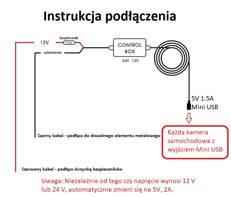 Ten zestaw przewodów może być używany przez prawie wszystkie urządzenia mini USB, takie jak kamery samochodowe, urządzenia nawigacyjne GPS, wykrywacze radarów itp.