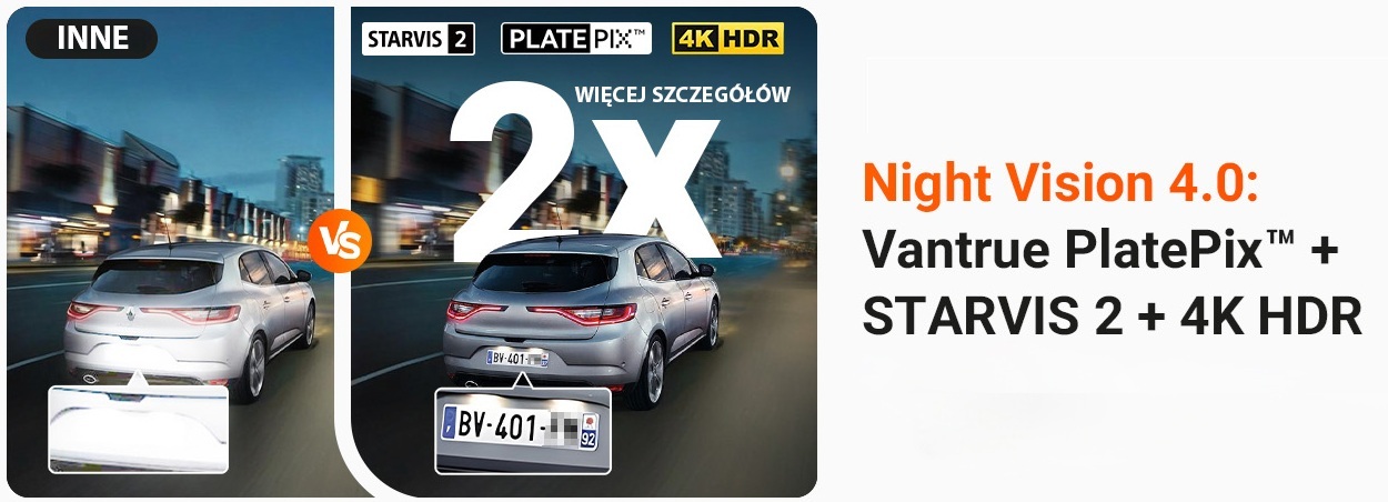Tryb Vantrue PlatePix™ poprawia rozpoznawanie tablic rejestracyjnych, skupiając przednią kamerę na uchwyceniu ostrych szczegółów. Możesz zaplanować automatyczne uruchamianie tego trybu w określonych godzinach, takich jak jazda nocą, dzięki czemu nigdy nie przegapisz ważnych informacji na nagraniach.