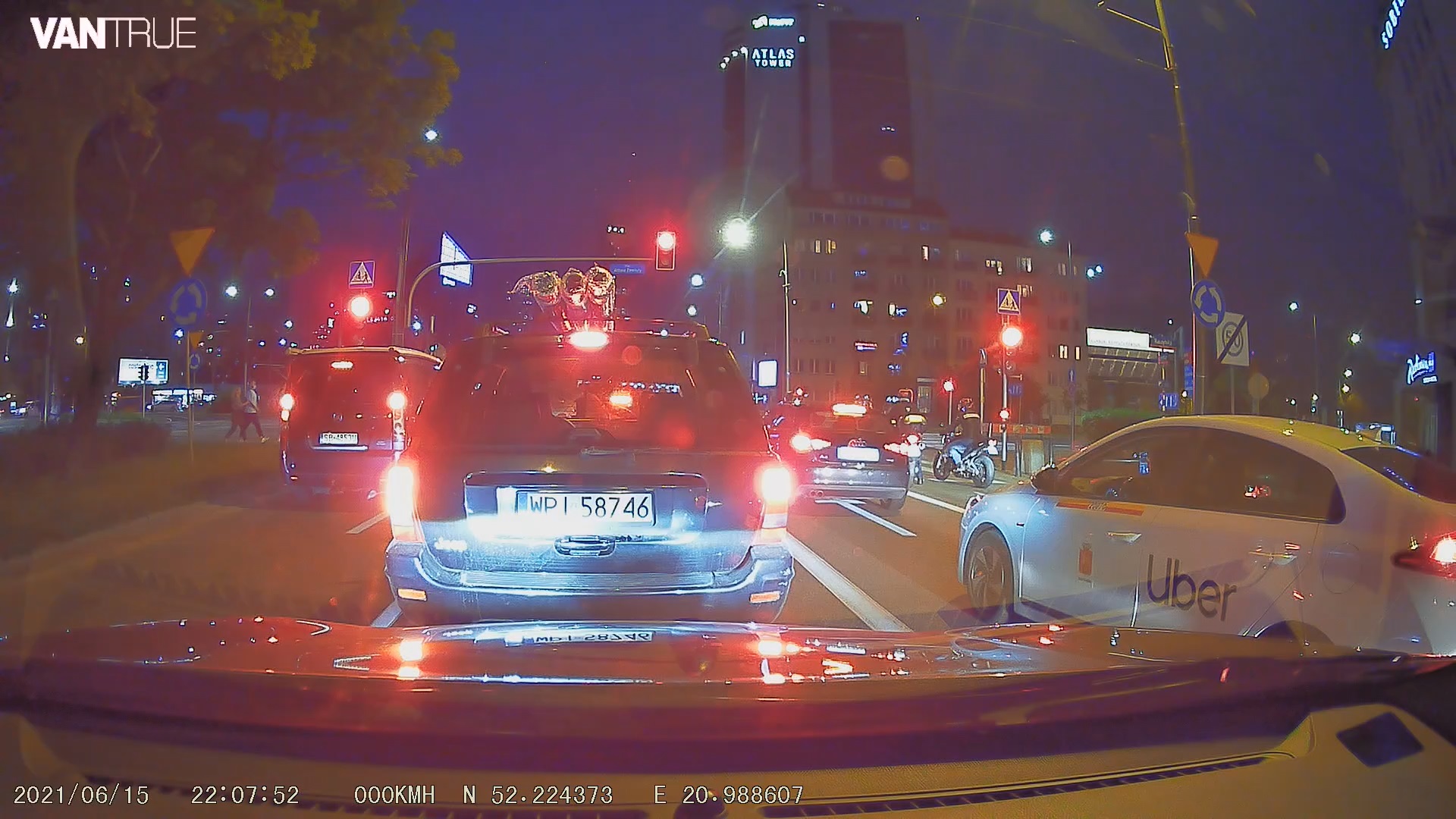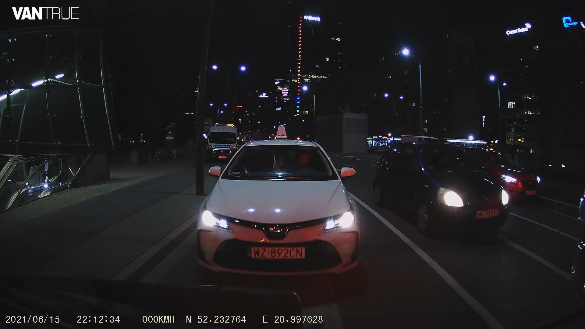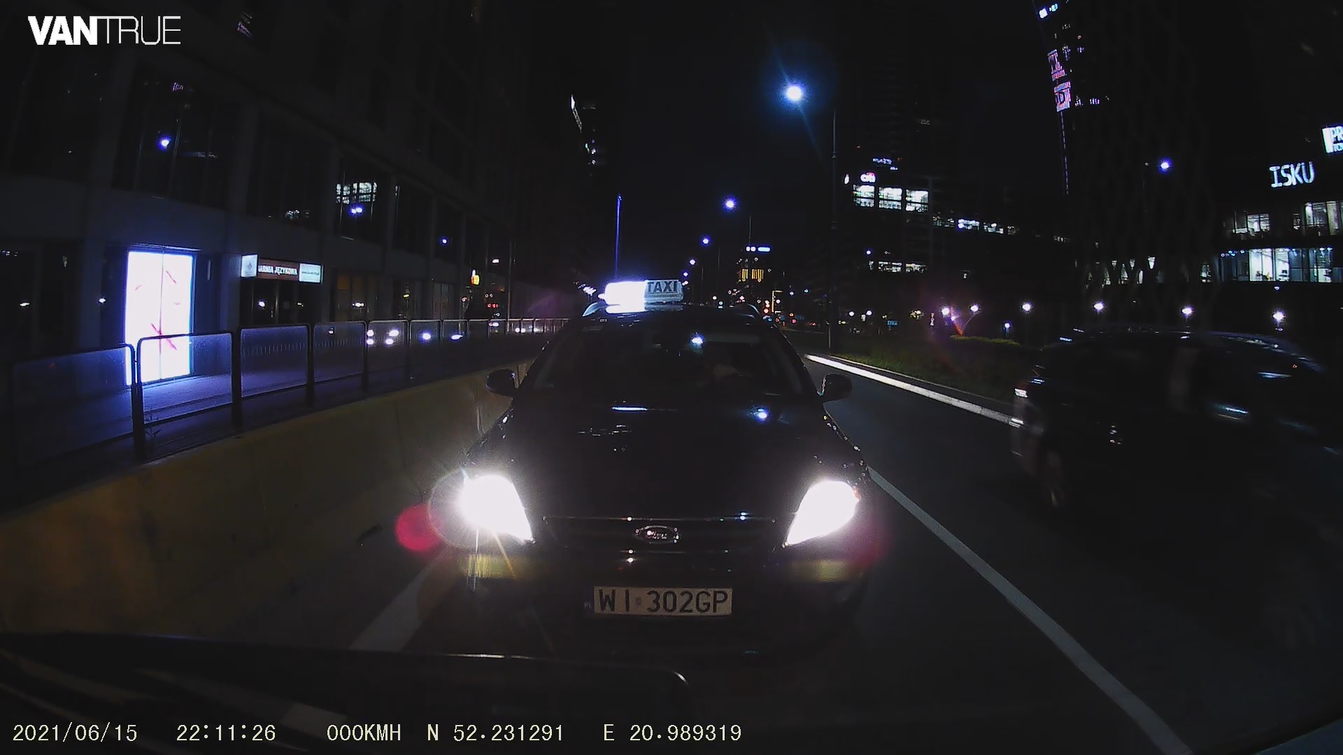 Zmiana wartości ekspozycji to bardzo użyteczna funkcja kamery samochodowej Vantrue S1. Wartości ustawiamy ręcznie między +2 a -2. Należy poeksperymentować z ustawieniami gdyż każde auto jest inne, w każdym aucie kamera będzie ustawiona pod różnymi kątami. Nie zawsze kamera samochodowa nawet z najwyższej półki gwarantuje odczyt tablic rejestracyjnych. Wiek i czystość przedniej szyby, kąt padania światła, prędkość, warunki atmosferyczne – jest wiele zmiennych, które utrudniają odczyt numerów tablic rejestracyjnych. Nie ma też idealnych ustawień – możemy wybierać między jaśniejszym otoczeniem, czasem nawet przepalonym obrazem, a obrazem może i ze zbyt ciemnym tłem ale za to w pewnych momentach dobrze pokazującym tablice rejestracyjne, które jako, że są koloru białego powodują zwykle ogromne odbicia światła. Aby w pełni zrozumieć możliwości ekspozycji proszę zapoznać się z poniższymi migawkami z nagrań nocnych.