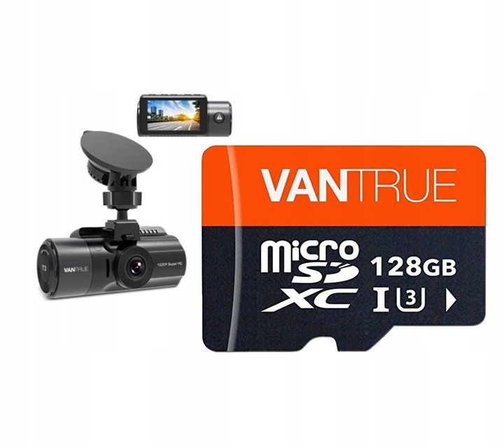 W zestawie znajdziesz Vantrue T3 z adapterem zasilania pod obd2 oraz dedykowaną kartę pamięci Vantrue 128GB!