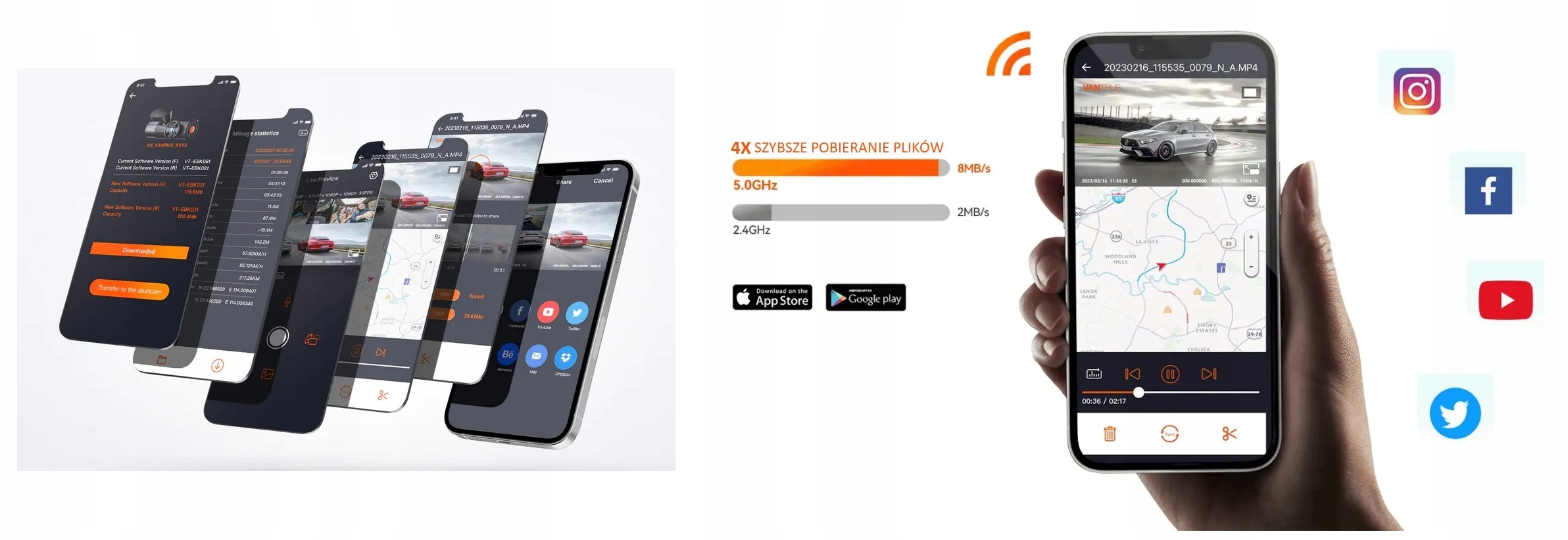 Wbudowany odbiornik WiFi ułatwia przeglądania naszych nagrań. WiFi pracuje także w zakresie 5GHz co sprawia, że przeglądanie czy pobieranie plików trwa dosłownie chwilę. Mocno rozbudowana, a zarazem niezwykle intuicyjna aplikacja Vantrue to kolejna zaleta tego 2-kanałowego wideorejestratora. Pobieranie, edytowanie nagrań oraz udostępnianie ich w social media to tylko niektóre z jej funkcji. Możemy pobrać raport z naszej podróży w formie pdf lub jpeg z którego odczytamy naszą średnią prędkość, ilość przejechanych kilometrów itp. Z pozycji aplikacji możemy również zaktualizować urządzenie.