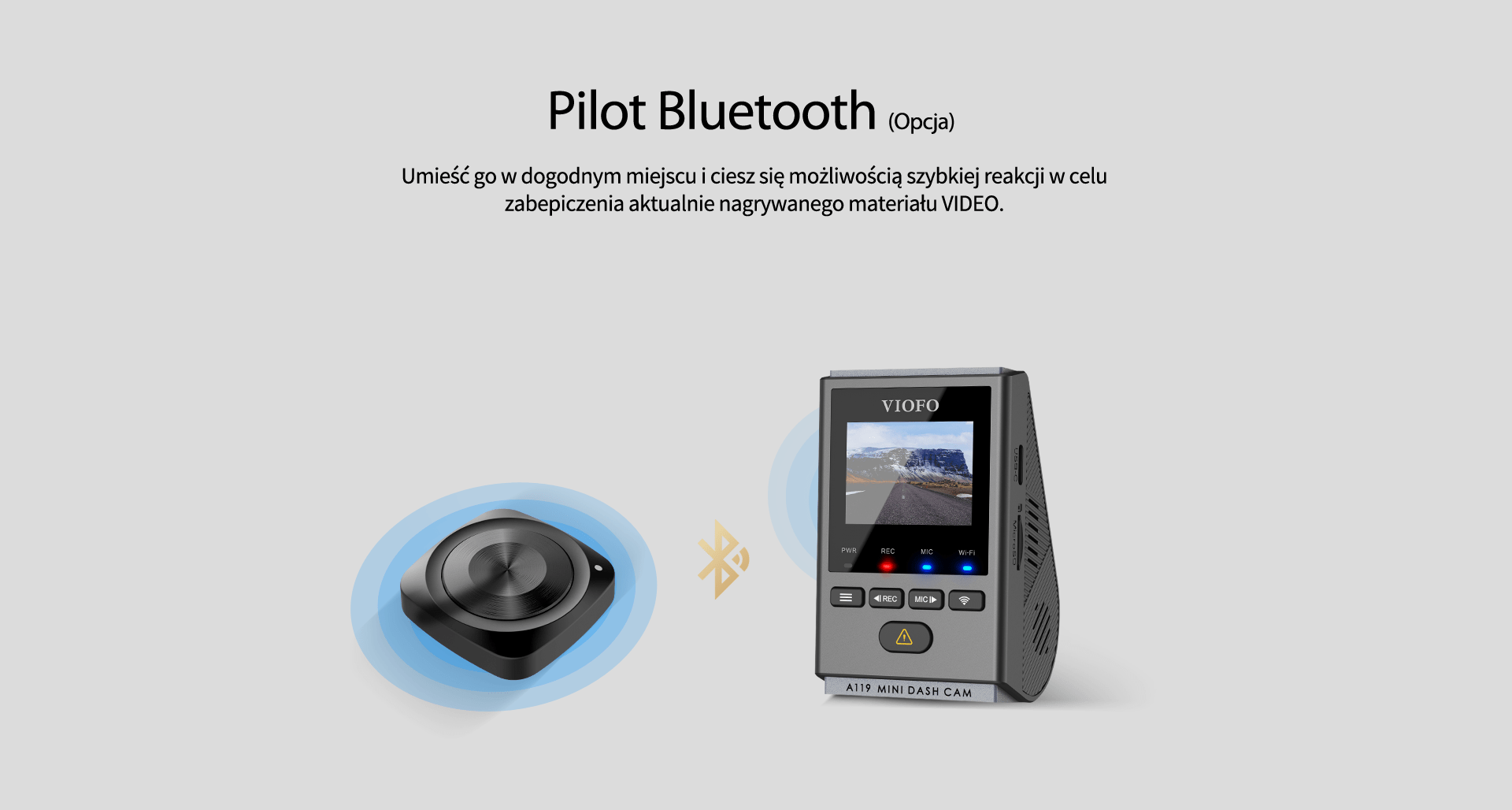 VIOFO A119 MINI ma wbudowany zaawansowany moduł WIFI pracujący w paśmie 2.4Ghz oraz 5Ghz. Sterowania kamery może być realizowane np. ze smartfona dzięki darmowej aplikacji iOS/Android o nazwie VIOFO. Dodatkowo kamera posiada moduł BLUETOOTH, do którego będzie można sparować przycisk “zabezpiecz nagranie”.