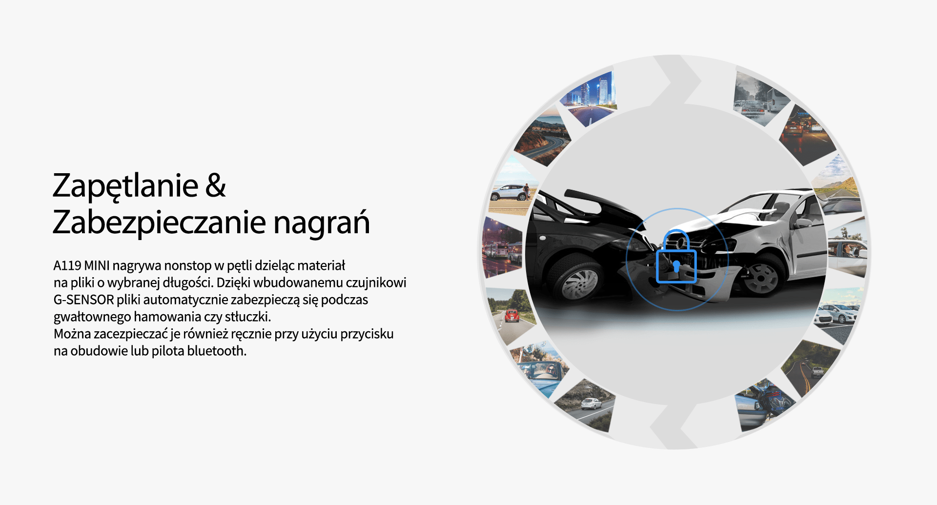 Detekcja ruchu, autmatyczny start po podaniu zasilania i wyłączenie, G-sensor, zapętlanie, znacznik daty i godziny, rejestracji, dodatkowej treści na nagraniu