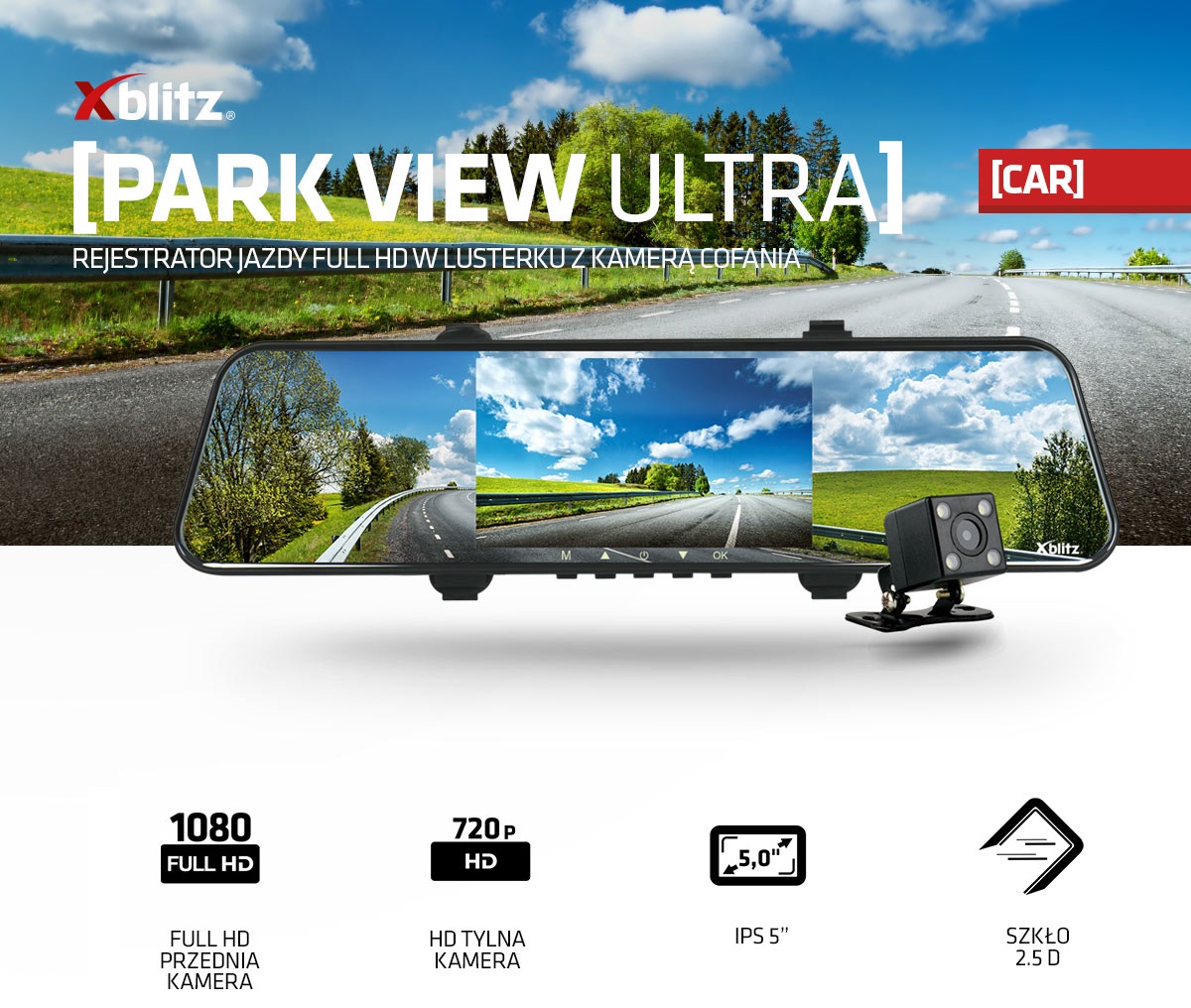 Xblitz Park View Ultra to zestaw dwóch kamer – przedniej oraz tylnej. Kamera przednia jest wbudowana w urządzenie natomiast tylna kamera pełni również funkcję kamery cofania. Obiektywy obu kamer są szerokokątne dzięki czemu gwarantują duże pole widzenia.