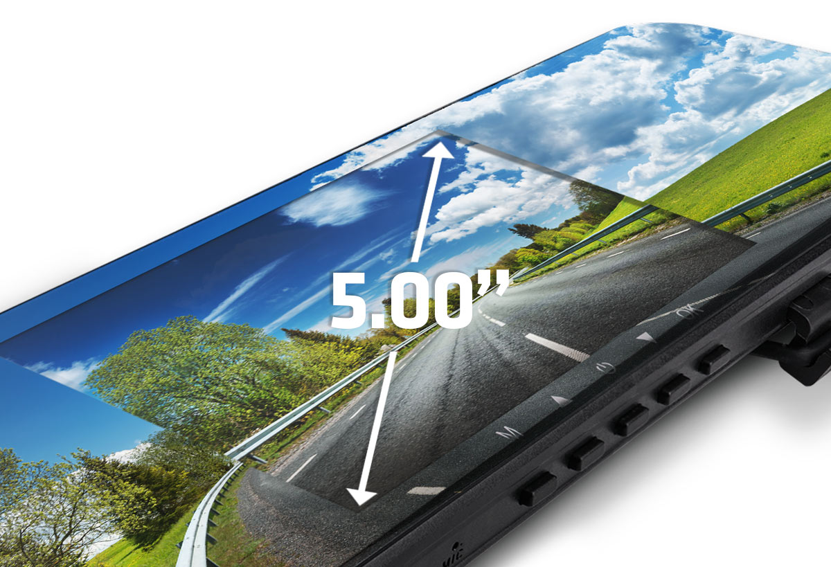 Wyświetlacz to 5-cio calowy ekran na którym widać podgląd nagrania w czasie rzeczywistym. Na urządzeniu możemy przeglądać także archiwalne nagrania. Kamera samochodowa Xblitz Park View Ultra pełni również funkcję lusterka wstecznego.
